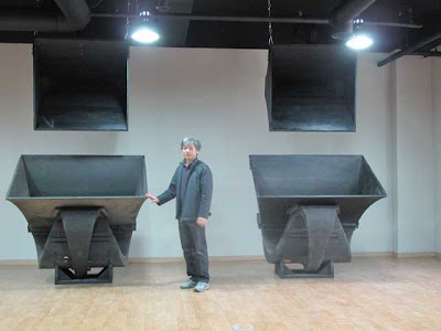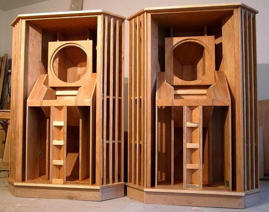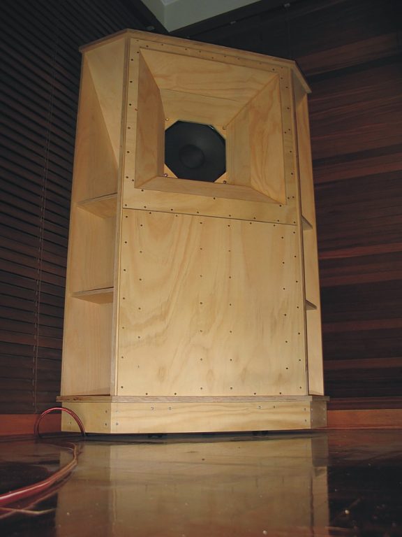You can see the big horn exits on the sides. The cone in the middle is a 15″ driver, to give an idea of the size.