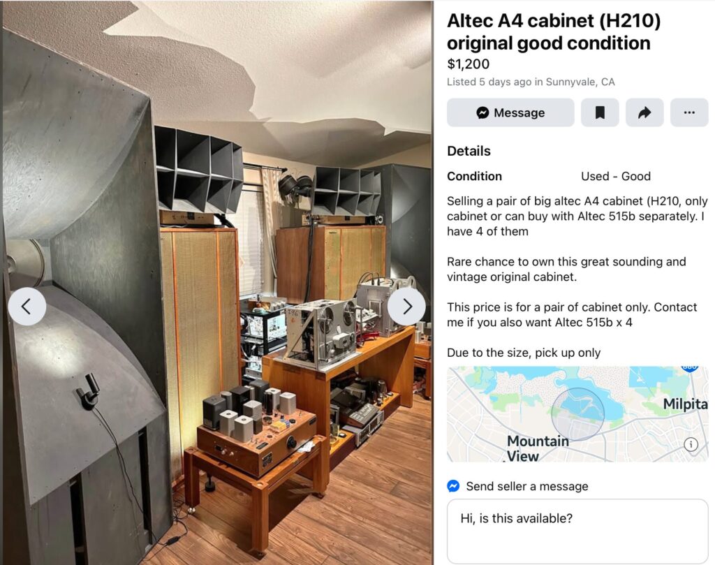 I don’t really recommend this sort of thing, but it is cool that someone did it, and he probably had more fun along the way than the guy who spent $5000 on a power cord. Altec 210 bass horns from the A2 system; Altec Manta Ray horns (conical, with a diffusion slot throat, basically the conical version of the JBL 2360) and some really big cones for lower bass duty. These similar Fostex woofers (not the same) are expensive, but the rest of it is basically a circa-1990 junkpile system. If you replaced the big woofers with more standard-production 18″ woofers — which are certainly adequate, when you have six of them — you could have probably got the whole thing done for $10,000, even including eight 515E woofers. (More today, due to inflation and the increasing scarcity of old Altec theater gear.)